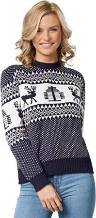 900829 Damen Weihnachtspullover, mit Eisblumen, Rentieren und Schneeflocken, blau weiß - Diverse Größen - (XL | Nr. 303353)