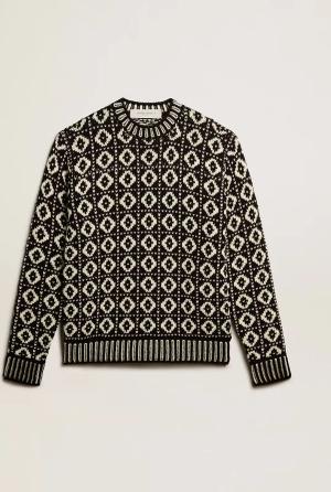 Rundhalspullover Mit Geometrischen Motiven In Antikweiß Und Schwarz, Mann, Größe: L