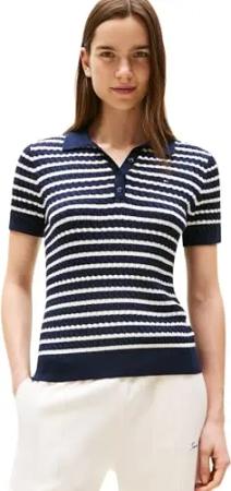 Damen Poloshirt Kurzarm Cable Sweater mit Knopfleiste, Mehrfarbig (Dark Night Navy/Ivory Silk STP), L