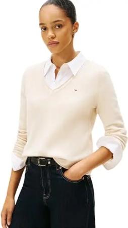 Damen Pullover Soft Wool mit V-Ausschnitt, Elfenbein (Heather Oatmilk), XXL
