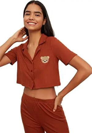 Damen Unifarben Gestrickt T-Shirt-Hose Große Größen in Pyjama-Set, Braun, XL