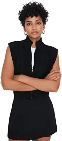 Damen Crop Knitwear Cardigan Sweater Stehkragen Ärmellos Schwarz Strickweste, Schwarz, S