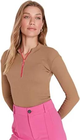Damen Einfarbig Dünn Strick Bodysuit, Zimt, 36
