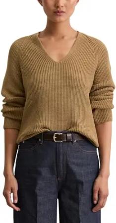 Marc OߴPolo Damen Strickpullover mit V-Ausschnitt Relaxed Fit, Beige (Pure Sand), XXS