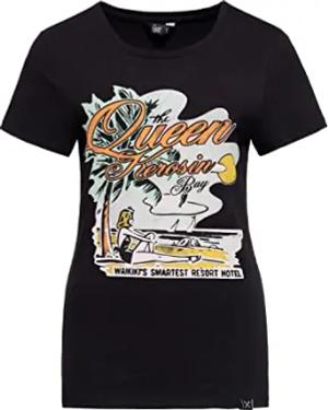 Damen Print T-Shirt Vintage Shirt Slim Fit Frontprint Kurzarm Retro Hawaii Waikiki Pin-Up 50S Queens Bay