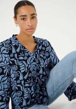 Langarm-Bluse KAellen 36, Blue Flower Leaf Print 36