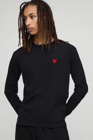 Black Regular Fit Heart Embroidered Long Sleeve T-Shirt