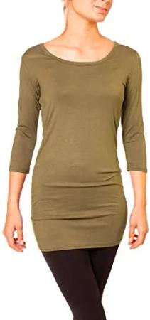 Damen Basic 3/4 Arm T-Shirt Rundhals - langes Unterziehshirt - Longshirt Skinny Fit 1098 - Oliv M/L