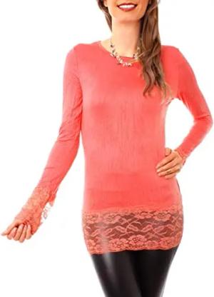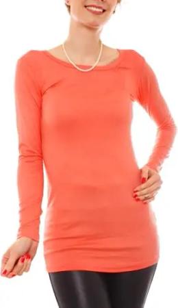 Damen Basic Langarmshirt - Rundhals Longshirt - Unterziehshirt Skinny Fit 1098A - Koralle M/L