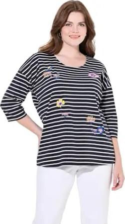 Damen große Größen Übergrößen Plus Size Ringelshirt, Stickerei, Oversized, Rundhals, 3/4-Arm Marine 54+ 837433130-54+