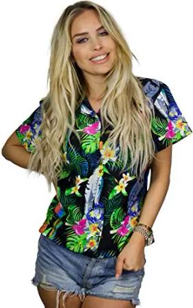 Funky Hawaii-Bluse-Hemd, Damen, Kurzarm, Parrot-Cockatoo, Schwarz, L