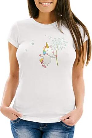 Damen T-Shirt Einhorn mit Pusteblume Unicorn with Dandelion Slim Fit weiß XS
