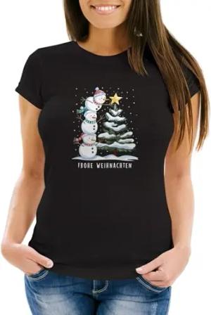 Damen T-Shirt Frohe Weihnachten Schneemann Design Aufdruck Schrift Weihnachtsoutfit Lustig Schwarz M