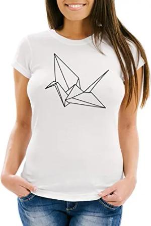 Damen T-Shirt Origami Kranich Crane Vogel Bird Slim Fit Weiss M