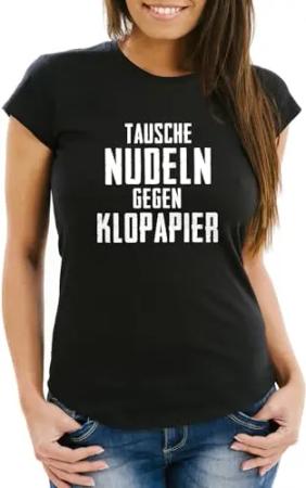 Damen T-Shirt Tausche Nudeln gegen Klopapier Virus Pandemie 2020 hamstern bunkern Fun-Shirt Spruch lustig Schwarz XS