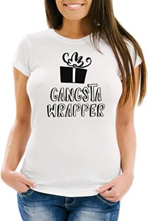 Damen T-Shirt Weihnachtsshirt Gangsta Wrapper Tasse Weihnachten lustig Geschenk Einpacker Slim Fit Weiss S