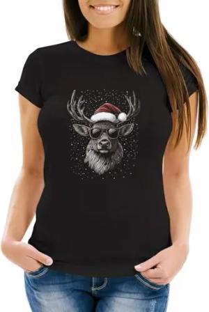 Weihnachtsshirt Damen Rentier Elch T-Shirt Weihnachten Lustig Weihnachtsoutfit Frauen Schwarz XS