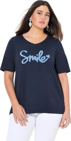 Damen große Größen Übergrößen Plus Size T-Shirt, Schriftdruck, Saumband, V-Ausschnitt, Halbarm Marine 62+ 838616130-62+