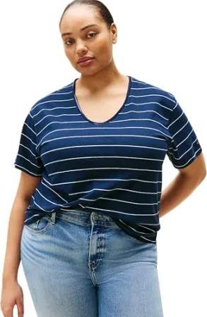 Damen T-Shirt Kurzarm Modern Linen mit V-Ausschnitt, Mehrfarbig (Big Stp Dark Night Navy), 48
