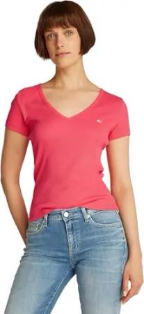 Damen T-Shirt Kurzarm Slim Essential Rib V-Ausschnitt, Rot (Amour), XXS