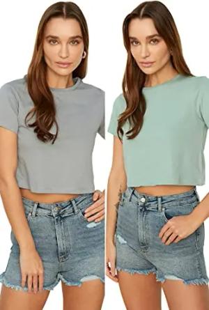 Damen - Beg 100% katoen ronde kraag 2 pack crop gebreid T-shirt T Shirt, Gray, S EU