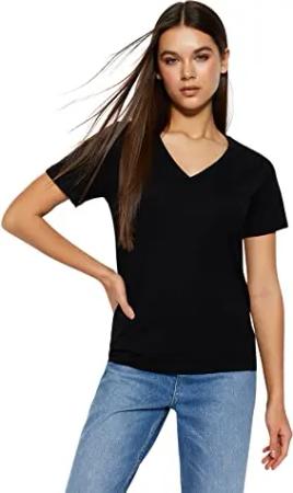 Damen Black 100% Baumwollbasis Basis V-Ausschnitt-Strick-T-Shirt T-Shirt23TS00001, Black XL