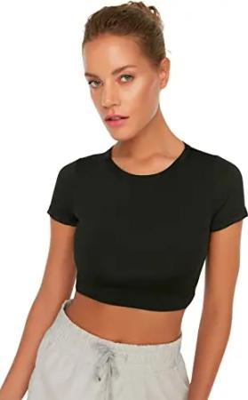 Damen Crop Gestricktes T-shirt T Shirt, Schwarz, M EU