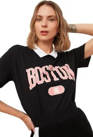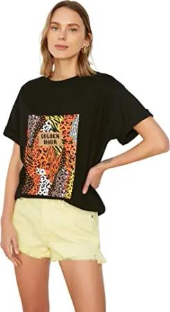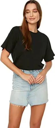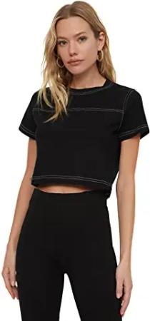 Damen Trendyol 100% baumwolle fahrrad kragen freund gestrickt t-shirt T-Shirt, Schwarz, XS