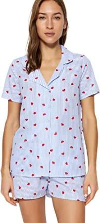 Damen geometrischem Muster, Knopf, detailliert, mittellang, gewebtes Hemd, kurzes Set Pyjama, blau, 62 (2er Pack)