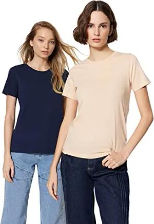 Damen Trendyol - 100% Baumwolle Suprem Bike Collar 2 Paket gestricktes T-Shirt - T-Shirt, Navy-Beigie, XS