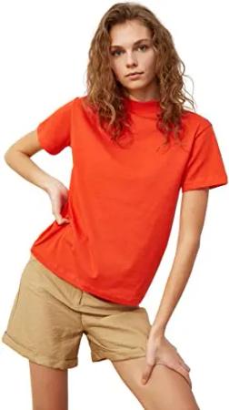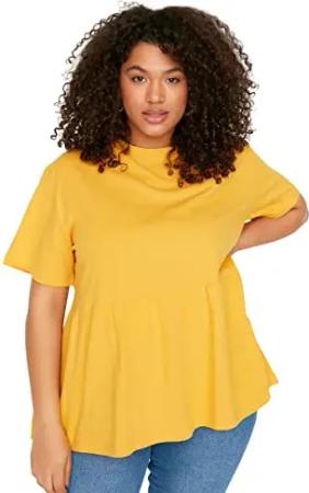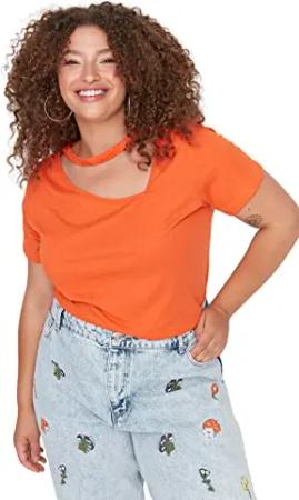 Damen Trendyol Damen-t-shirt, Übergröße, Standard-kropfband, Hoher Halsausschnitt, Gewebt, Übergröße Hemd, Orange, XXL Große Größen EU