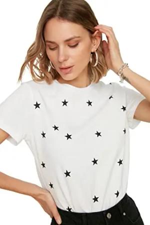 Damen Weiß 100% Baumwollstern Bedruckt regelmäßig/regulärer Fit Crew Neck Strick T-Shirt T-Shirt 20TS0757, Weiß XS