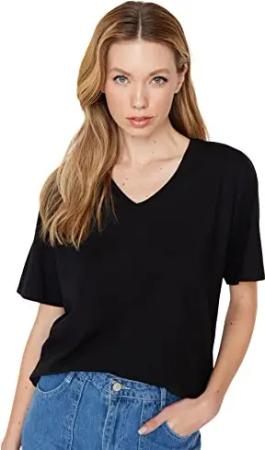 Damen Woman Boyfriend Basic V Neck Knit T-Shirt Hemd, Schwarz, X-Large