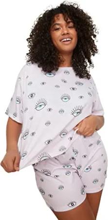 Damen Women Plain Knit T-Shirt-Short Plus Size Pajamas Set Pyjama, Powder, 3XL