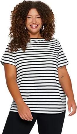 Damen Women Regular fit Basic Boat Neck Knit Plus Size T-Shirt Hemd, schwarz/weiß, XX-Large