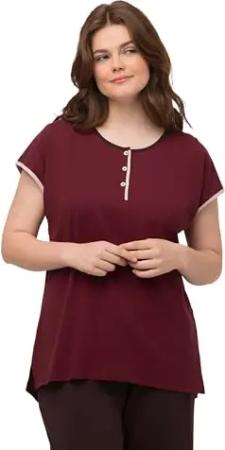 Damen große Größen Übergrößen Plus Size Pyjama-T-Shirt, Paspel, Rundhals, Halbarm, Biobaumwolle Beere 46+ 820107339-46+