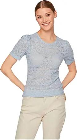 Elegantes Damen Kurzarm T-Shirt mit Einfarbig mit Crepe Muster, Farben:Blau-4, Größe:42