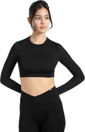 Longsleeve Damen Tisha, Cropped Sportshirt mit Rundhals, Funktionsshirt elastisches Unterbrustbund, bequemes Langarmshirt, ideal für Alltag, Freizeit, Fitness, Yoga, Layering