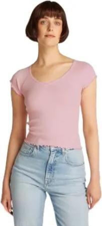 Damen T-Shirt Kurzarm Essential Rib Slim Fit, Rosa (Tahiti Berry), XXL