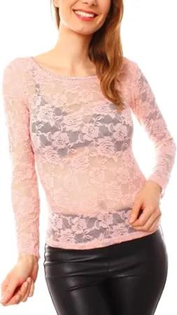 Damen Langarmshirt mit Spitze - transparente Mesh Bluse - Rundhals Skinny Fit OneSize 1095 - Pfirsichrosa