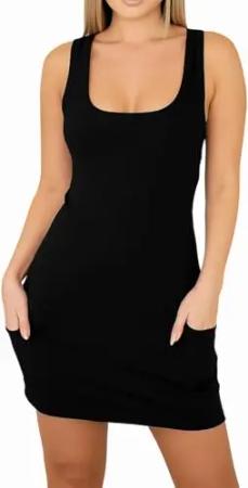 Damen Longshirt Kleid ärmellos mit Taschen, Figurbetonter Schnitt, Rundhals Schwarz S
