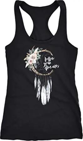Damen Tank-Top Traumfänger Dreamcatcher Follow Your Dreams Spruch Blumen Federn Spruch Boho Racerback schwarz M