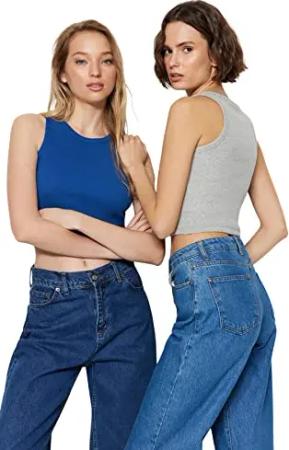Damen enganliegendes Basic Neckholder-Strick Singlet Hemd, Grau/Marineblau, Large