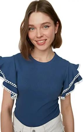 Damen Indigo Frilly gestrickte Bluse Blouse, Indigo, L