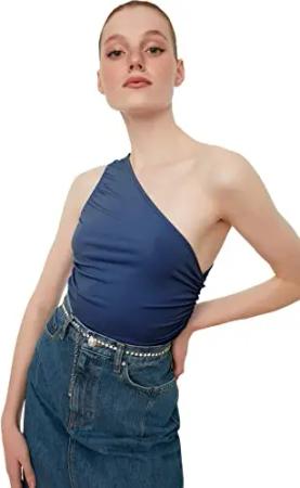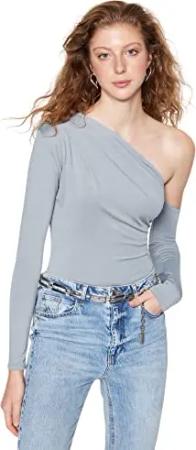 Damen Woman Fitted Asymmetric Asymmetrical Collar Knit Bodysuit Hemd, Gray, Small