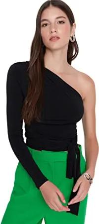 Damen Slim Fit Basic Asymmetrischer Kragen Strickware Bluse, Schwarz, Small