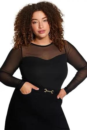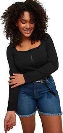 Damen Woman Fitted Bodycon Square Collar Knit Plus Size Blouse Hemd, Black, X-Large