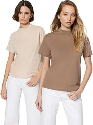 Damen TWOSS20TS1500 Basics Regular Fit Basic Stehkragen Strick T-Shirt, Beige, S