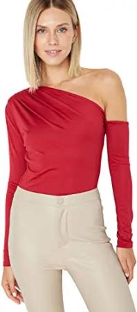 Damen Woman Fitted Asymmetric Asymmetrical Collar Knit Bodysuit Hemd, Burgundy, Large