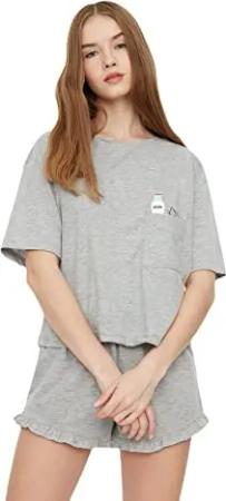 Women Graphic Ruffle Detailed Middle Knit T-Shirt-Short Pajama Set Pyjama,